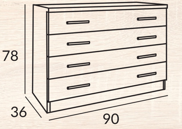 📏 4 cajones, Anchura: 90cm, Altura: 78cm, Profundidad: 36cm.
